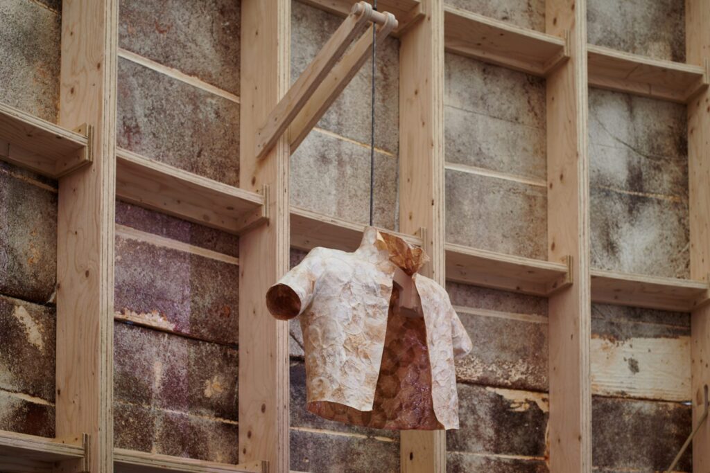 Pavyonun dış yüzeyindeki doğal renk geçişleri, miselyumun büyüme sürecinde aldığı tonlardan kaynaklanıyor; yapının estetiği, malzemenin kendiliğindenliğine bırakılmış. İç mekânda ise saz, kamış ve pamuk gibi diğer biyobaz malzemelerle zenginleştirilen bir malzeme atlası sergileniyor. Ziyaretçiler bu mekânda yalnızca bir yapı görmüyor, adeta “yaşayan” bir malzeme ekosistemine giriyorlar.